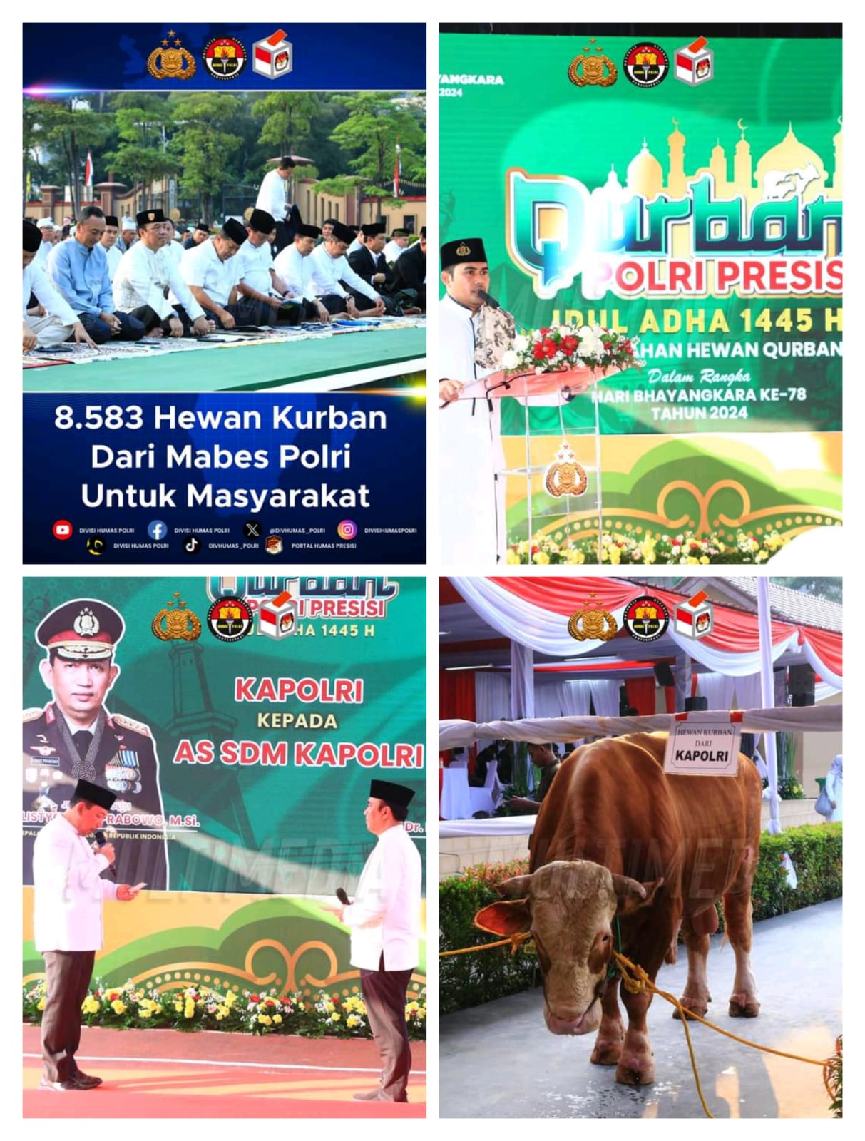 “Untuk pendistribusian hewan kurban Pejabat Utama Mabes diarahkan ke Komplek Polri, Asrama Polri, pondok pesantren dan yayasan yatim piatu, Mako Polres, serta Polsek se-Jabodetabek,” Tutur Kadiv Humas Polri, Irjen Pol. Dr. Sandi Nugroho, S.I.K., S.H., M.Hum., dalam keterangannya, TutupNya RED/A.setiawan