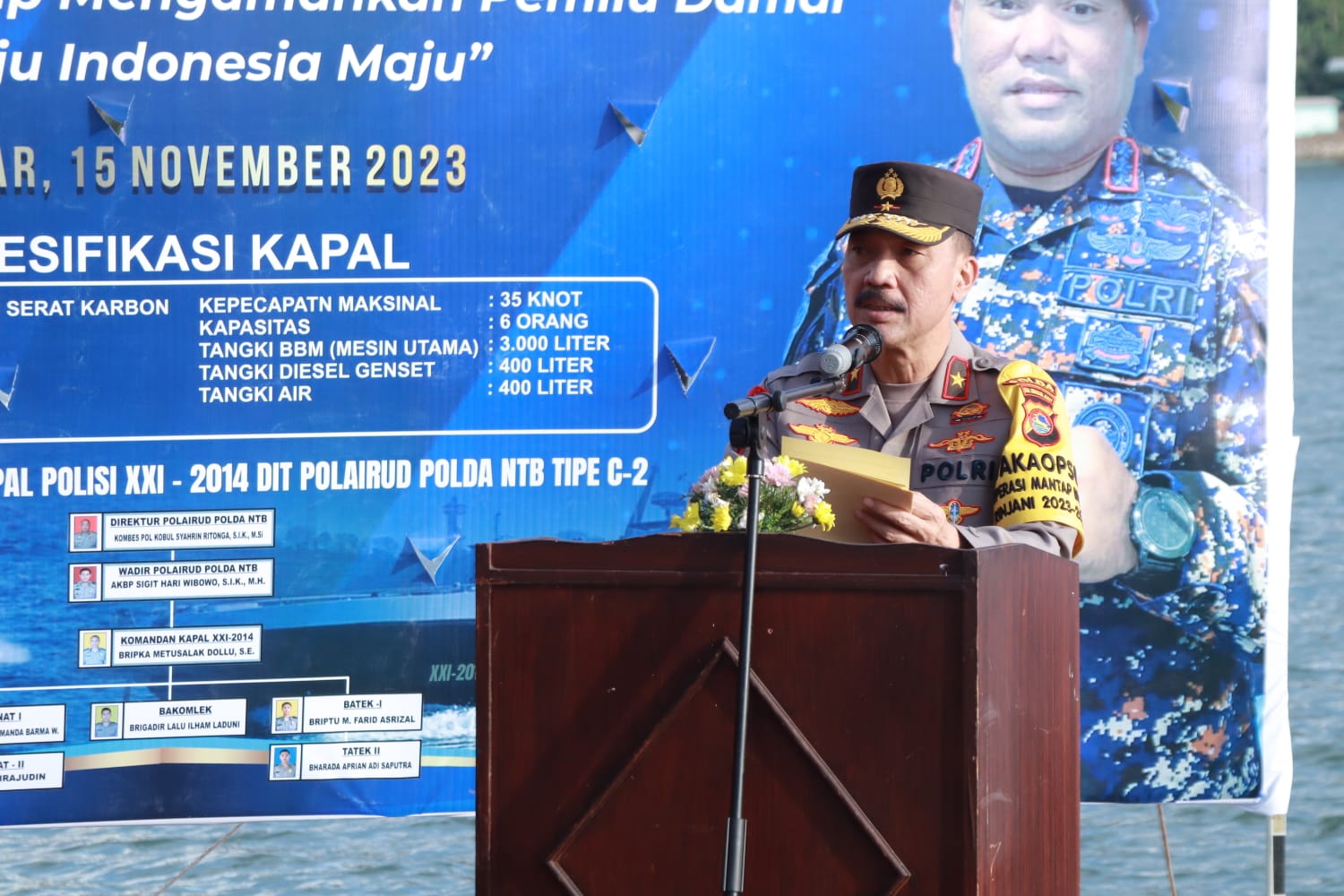 “Alhamdulillah hari ini kita meresmikan 1 unit Kapal Pemburu Cepat milik Ditpolairud Polda NTB sebagai penunjang pengamanan Harkamtibmas di wilayah hukum perairan Polda NTB, guna terselenggara nya perlindungan pengayoman dan pelayanan kepada masyarakat serta terbinanya ketentraman masyarakat dengan menjunjung tinggi Hak azasi manusia,”ungkapnya dalam sambutan tersebut.