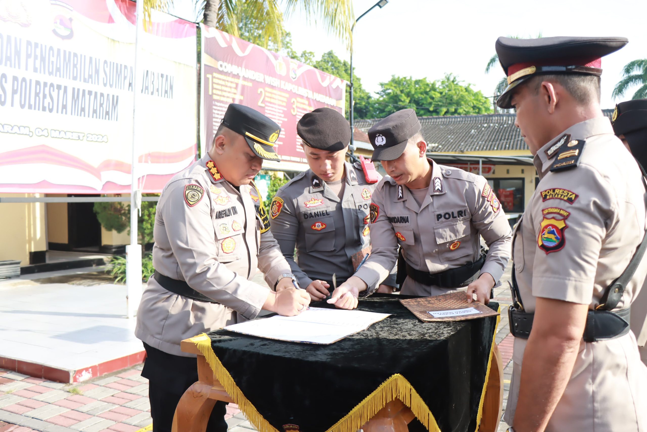 Diawali dengan Pembacaan Teks Pengambilan Sumpah oleh Kapolresta Mataram diikuti oleh pejabat yang diambil sumpah dan Penandatangan naskah berita acara sertijab, pakta Integritas serta berita acara pengambilan sumpah.