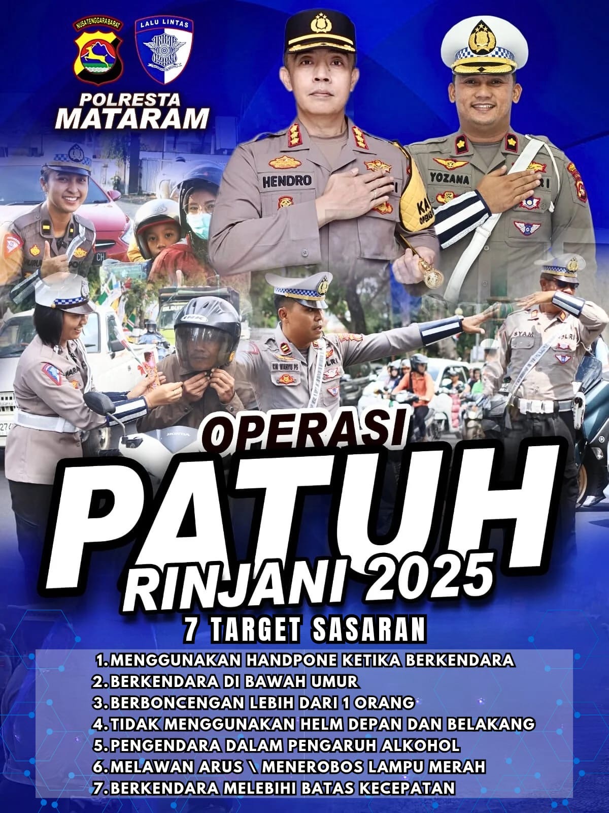 Kapolresta Mataram melalui Kasat Lalu Lintas, Kompol Yozana Fajri Sidik AF., S.IK., M.H., C.PHR. dalam keterangan persnya menjelaskan jika Operasi Patuh tahun ini, menekankan edukasi dan penindakan terhadap tujuh pelanggaran prioritas, yang kerap terjadi di wilayah Kota Mataram.