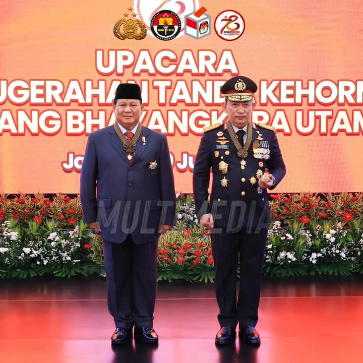 Jakarta, Hukrimsus.com — Kapolri Jenderal Polisi Drs. Listyo Sigit Prabowo, M.Si., menyematkan tanda kehormatan Bintang Bhayangkara Utama kepada Menteri Pertahanan RI Jenderal TNI (HOR) (Purn.) Prabowo Subianto dalam upacara penganugerahan tanda kehormatan di Gedung Rupattama, Mabes Polri, Jakarta, Kamis (20/6).