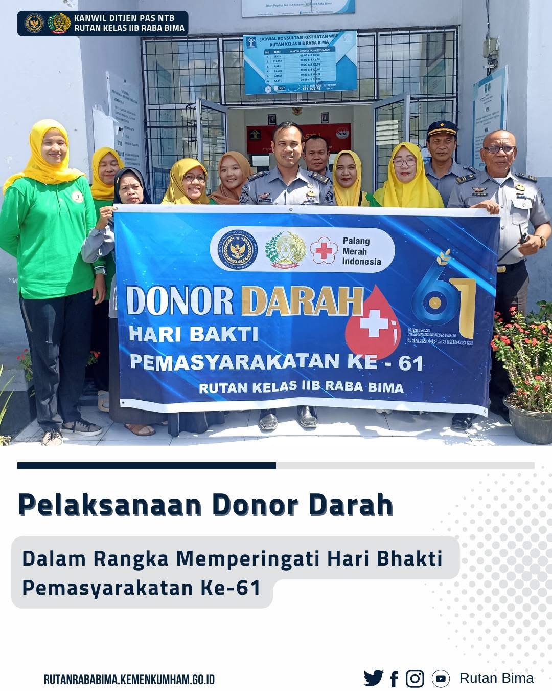 Bima NTB, Hukrimsus.com — Dalam rangka memperingati Hari Bhakti Pemasyarakatan ke-61 Tahun 2025, Rumah Tahanan Negara Kelas IIB Raba Bima telah melaksanakan kegiatan Donor Darah sebagai salah satu bentuk pengabdian sosial dan kepedulian terhadap masyarakat. Kegiatan ini mengusung tema “Pemasyarakatan PASTI Bermanfaat untuk Masyarakat”, yang menjadi semangat dalam setiap rangkaian peringatan tahun ini.
