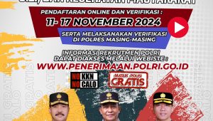 Pendaftaran dilakukan secara online dan verifikasi berlangsung mulai 11 hingga 17 November 2024. Calon peserta diwajibkan melakukan verifikasi data di Polres/Polresta masing-masing. Polri menegaskan jika seluruh tahapan rekrutmen dilakukan secara gratis dan bebas dari biaya apapun.