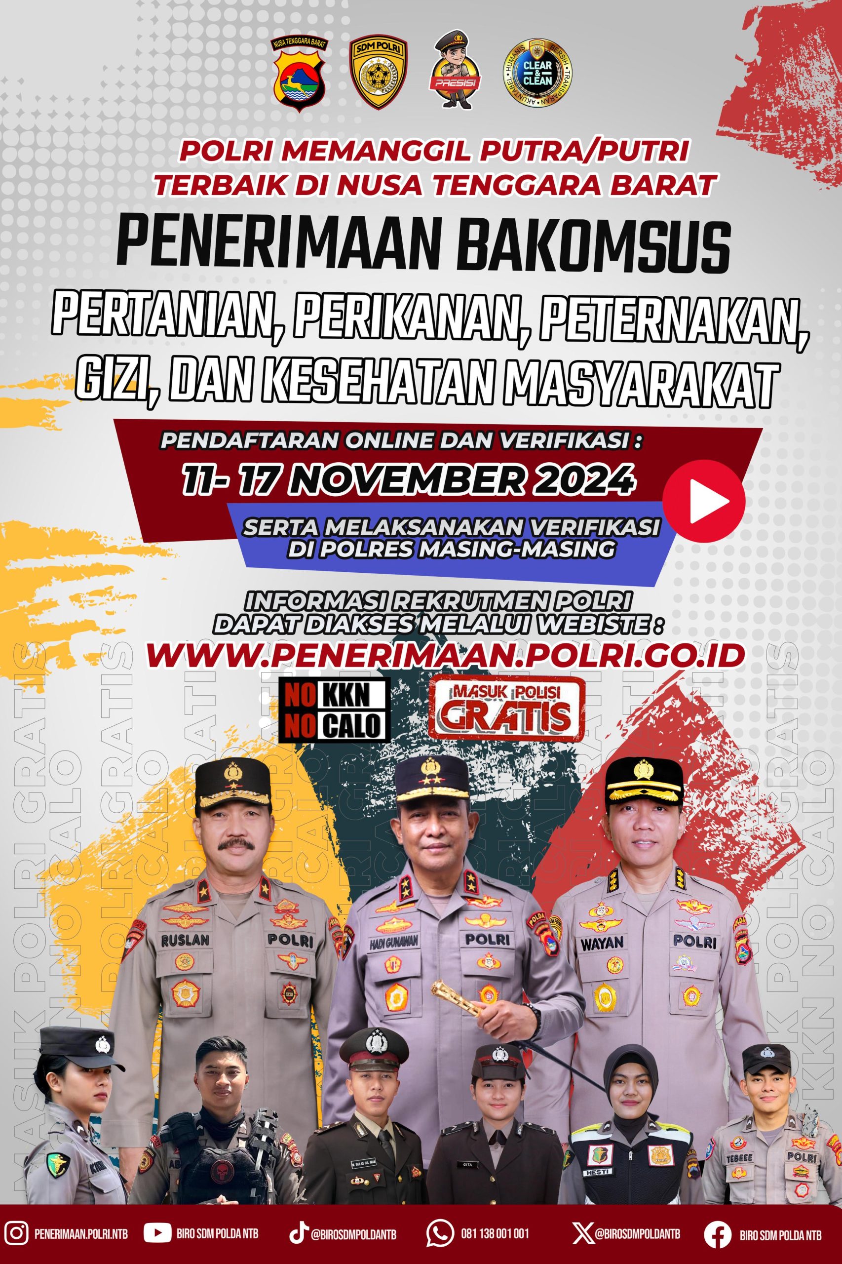 Polda NTB menjamin jika semua proses seleksi bebas dari praktik KKN (Korupsi, Kolusi, Nepotisme) dan menekankan jika rekrutmen sepenuhnya transparan dan bebas biaya. Informasi lebih lanjut dapat diakses melalui situs resmi: www.penerimaan.polri.go.id.