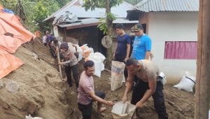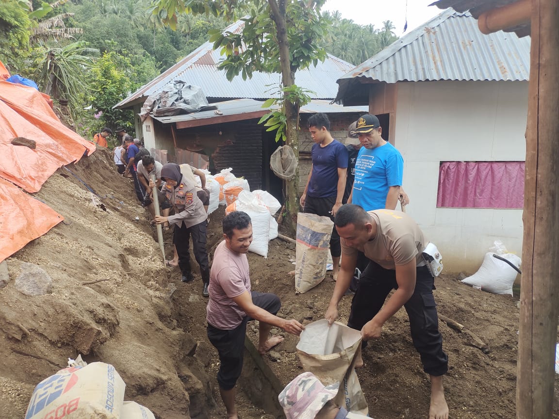 Menanggapi hal tersebut Kapolsek Gangga Iptu Henni Andriani, SH., turun langsung ke lokasi bersama anggota dan warga bergotong royong membersihkan tanah sisa longsor.