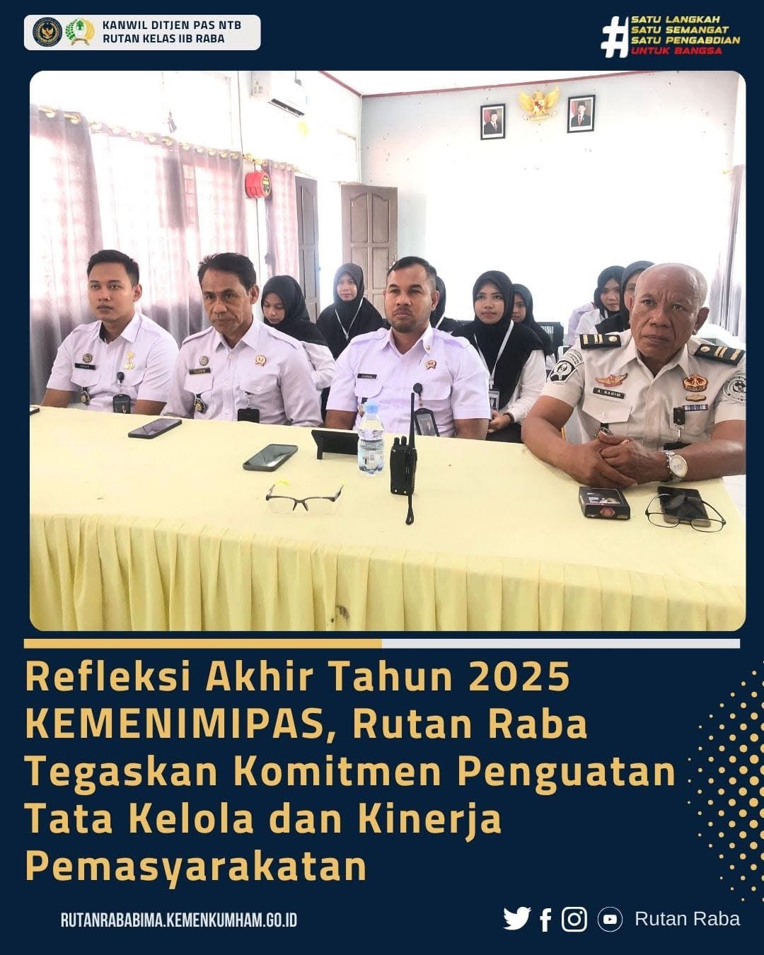 Bima NTB, Hukrimsus.com — Kepala Rumah Tahanan Negara Kelas IIB Raba bersama jajaran pejabat struktural, Aparatur Sipil Negara, serta peserta magang mengikuti kegiatan Refleksi Akhir Tahun 2025 Kementerian Imigrasi dan Pemasyarakatan (KEMENIMIPAS) secara virtual, Senin (29/12). Kegiatan ini dilaksanakan di Aula Rutan Raba sebagai bagian dari komitmen mendukung penguatan tata kelola dan peningkatan kinerja pemasyarakatan.